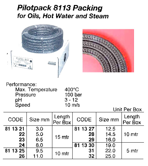 | 产品规格 | Greasy graphited, general purpose, non-asbestos, pump and valve packing. Each strand or high temperature BCX yarn is impregnated with a graphite lubricant to give good, firm, uniformly lubricated packing with a low coefficient of friction. Performance: Max. Temperature 400oC, Pressure 100 bar, pH 3-12, Speed 10 m/s, Applications: Rotary, reciprocating and static. Saturated steam, hot water, hot air and gases. Piston rods and valves rods. Ballast, bilge and cargo feed pumps. |