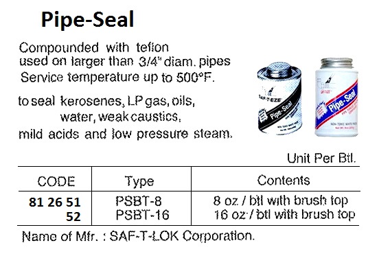 | 中文汉化 | 812651 管道密封剂 PSBT-8型 8盎司/瓶(带刷头) -----描述-----:该产品通过添加特氟龙制成,用于润滑接合部件的装配。它具有良好的耐化学性,适用于直径大于3/4英寸的管道,可密封煤油、液化石油气、油类、水、弱碱液、弱酸及低压蒸汽等介质。可在高达500°F(约260°C)的温度下于中等高压条件下使用,不会流动、滴落或分层,适用温度范围可达500°F。 |
