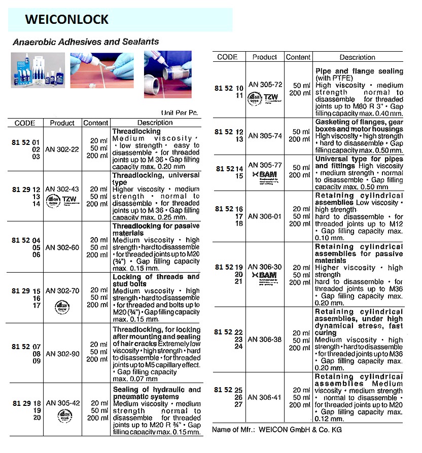 | 产品规格 | The ideal solution for construction, production and maintenance: WEICONLOCK? products are high quality anaerobic adhesives and sealants on the basis of special methacrylate resins, especially made for economical threadlocking, retaining and sealing of threaded, clyndrical and pipe assemblies. The Pen-System packaging offers easy dosing and application. Retaining cylindrical assemblies low viscosity ? high strength ? hard to disassemble. |