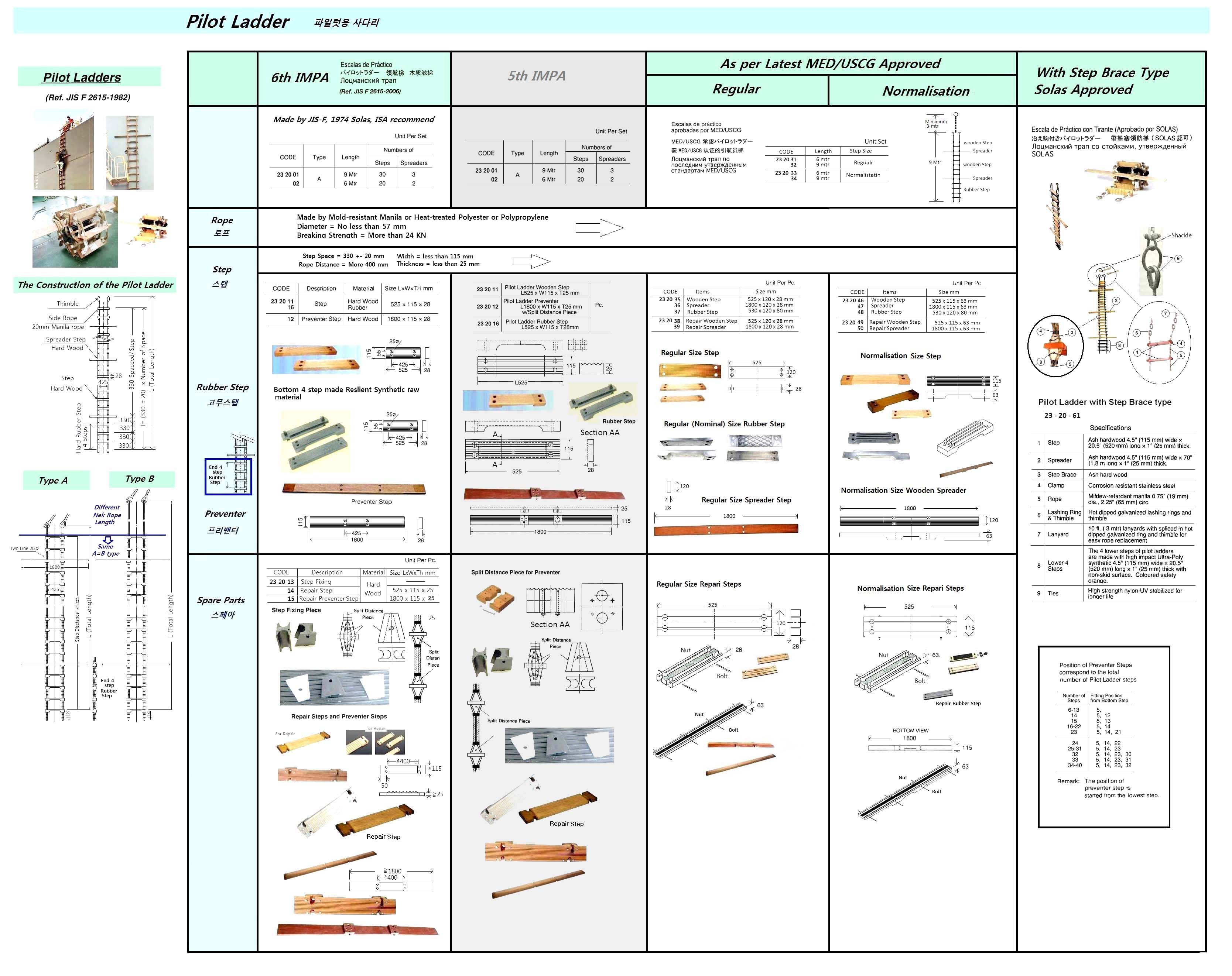 | 产品规格 | Fully comply with and exceed SOLAS Regulations and IMO Standards. These ladders are designed with new stainless steel clamping device tested to withstand loads up to 2,000 lbs (907.2 kilos). This new clamp will not slip or loosen with age. Manila rope and steps are fixed with hardwood step brace. All steps are made from Ash hardwood, but the bottom 4 steps are furnished with in synthetic. |