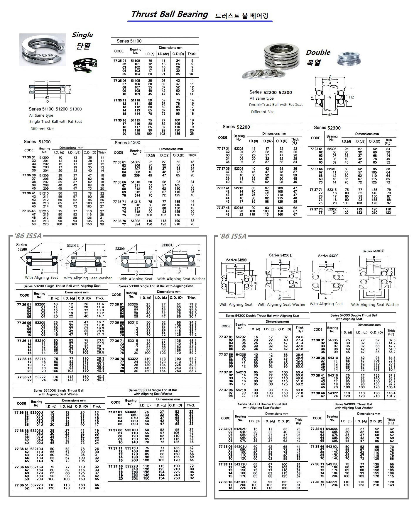| 中文汉化 | 773773 双向推力球轴承,带平底座,型号 52317 -----描述-----:推力球轴承由类似垫圈的带滚道沟槽的轴承环组成,安装在轴上的环称为内圈或轴垫圈,安装在轴承座上的则称为外圈或座垫圈。在双方向推力球轴承中,共有三个环,中间的环固定在轴上。单方向和双方向推力球轴承分别能够承受一个方向或两个方向的轴向载荷。此外,部分推力球轴承还配备了一个调心座垫圈,安装在外圈下方,用于补偿轴的偏斜或安装误差。小型轴承通常采用冲压钢板保持架,而较大型号则一般使用机加工保持架。上述特性适用于52300系列推力球轴承,该系列配备平底座,适合对中性良好的应用场合。没有后缀表示该轴承为开放式;“Z”表示单侧金属防尘盖,“ZZ”表示双侧金属防尘盖;“N”表示带有止动槽;“NR”表示带有止动槽和沟槽;“ZN”表示单侧金属防尘盖并带有止动槽;“LU”或“RS”表示单侧橡胶密封;“LLU”或“2RS”表示双侧橡胶密封;“C3”表示径向游隙比正常大;“M”表示使用机加工黄铜保持架,球滚动;“N”表示带有圆形止动槽;“RSR”表示单个密封圈;“T”表示由玻璃纤维增强聚酰胺制成的模制止动环型保持架;“ZR”表 |