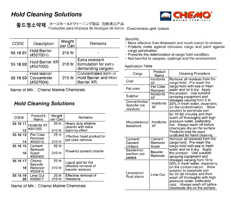 | 产品规格 | Hold Cleaning Solutions (After discharging): Cost effective, non-flammable, water based, heavy duty cleaners containing special surfactants, detergents and builders, for effectively removing all types of cargo stains and residues, after cargo discharge, while minimizing coating discolouration. Powerful cement cleaner. |