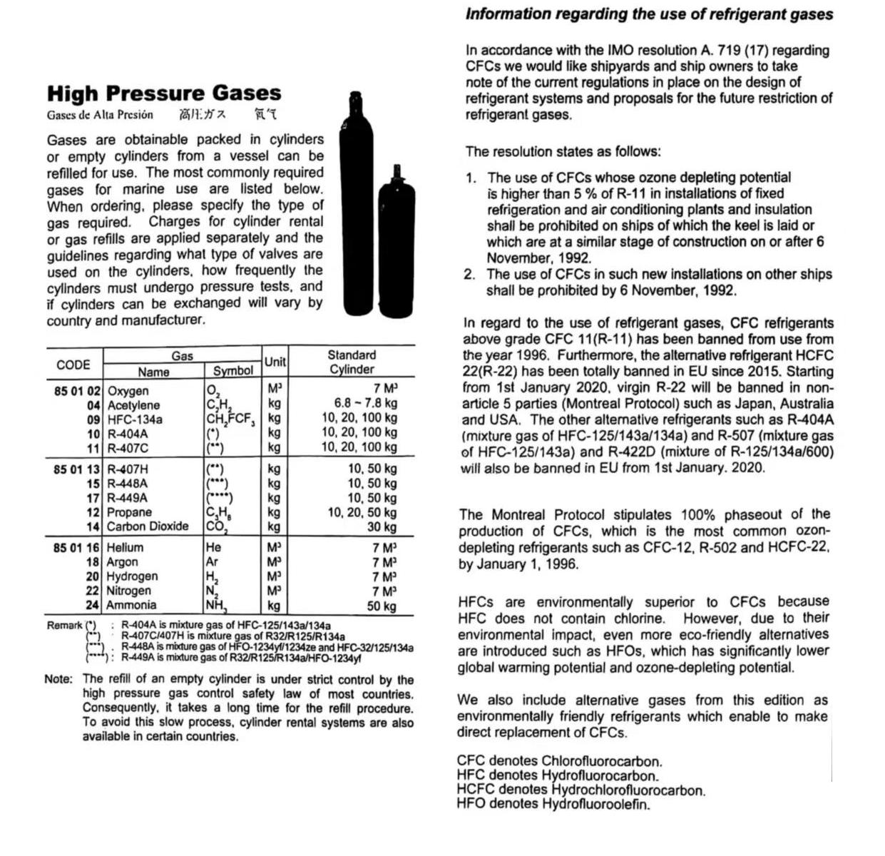 | 产品规格 | Gases are obtainable packed in cylinders or empty cylinders from a vessel can be refilled for use. The most commonly required gases for marine use are listed below. When ordering, please specify the type of gas required. Charges for cylinder rental or gas refills are applied separately and the guidelines regarding what type of valves are used on the cylinders, how frequently the cylinders must undergo pressure tests, and if cylinders can be exchanged will vary by country and manufacturer. |