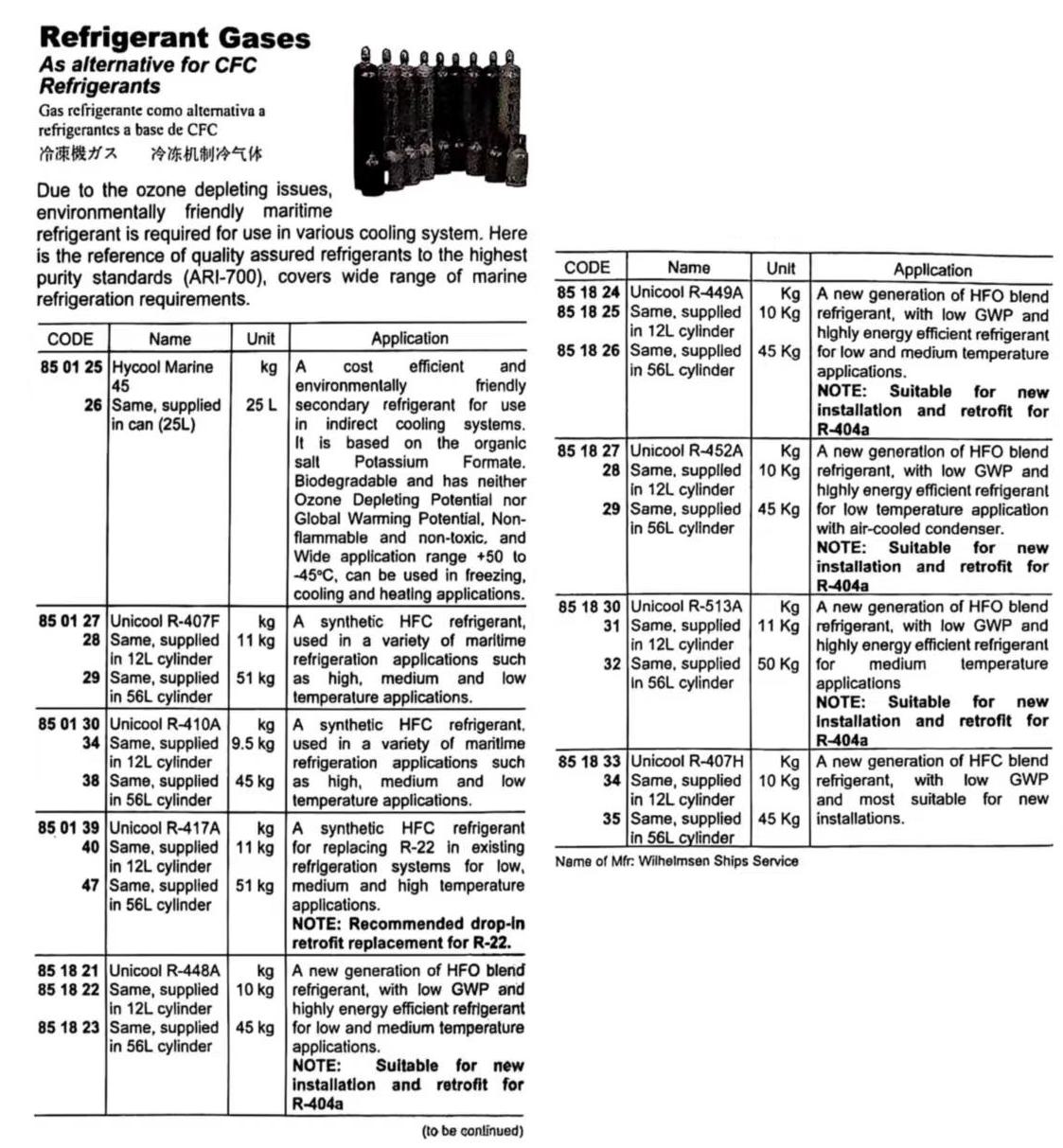 | 产品规格 | Due to the ozone depleting issues, environmentally friendly maritime refrigerant is required for use in various cooling system. Here is the reference of quality assured refrigerants to the highest purity standards (ARI-700), covers wide range of marine refrigeration requirements. A cost efficient and environmentally friendly secondary refrigerant for use in indirect cooling systems. It is based on the organic salt Potassium Formate. Biodegradable and has neither Ozone Depleting Potential nor Glo |